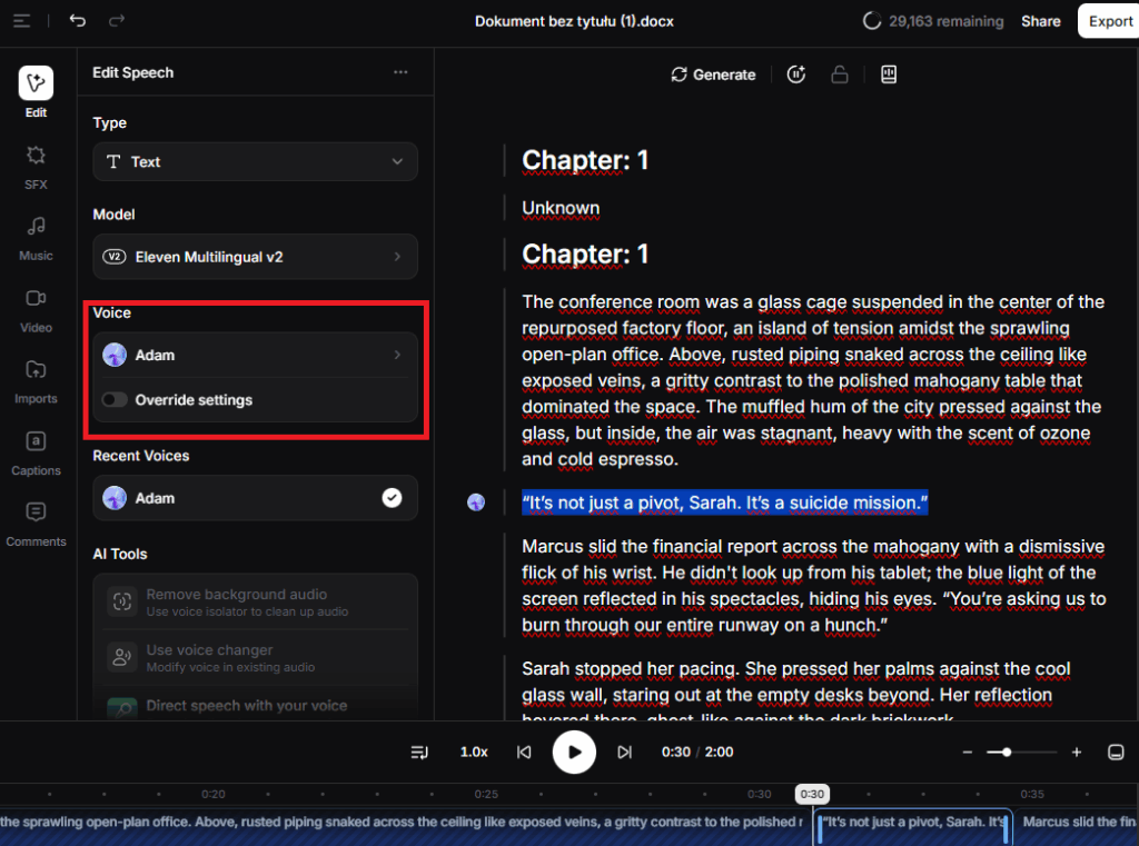 .epub,.pdf, or.txtfile directly. ElevenLabs will automatically organize it into chapters. - Assign the Narrator: Choose your default voice (e.g., Adam) for the main narration.