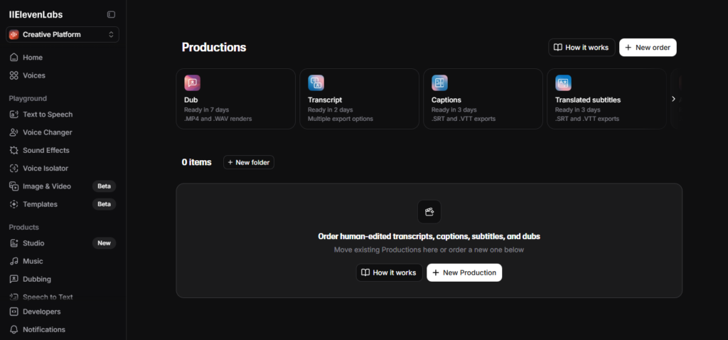 Productions: If you prefer a human touch over AI, this service connects you with a team of specialists to handle manual dubbing, transcription, captions, and subtitle translation.