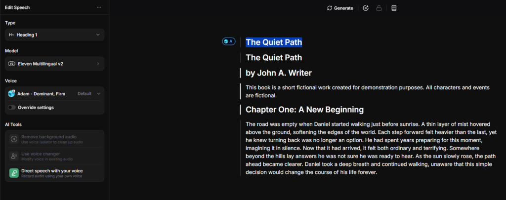 Pro Tip: Always test your voice settings on a short sentence (e.g., “This is a test.”) before pasting your entire script. This saves thousands of credits in the long run.